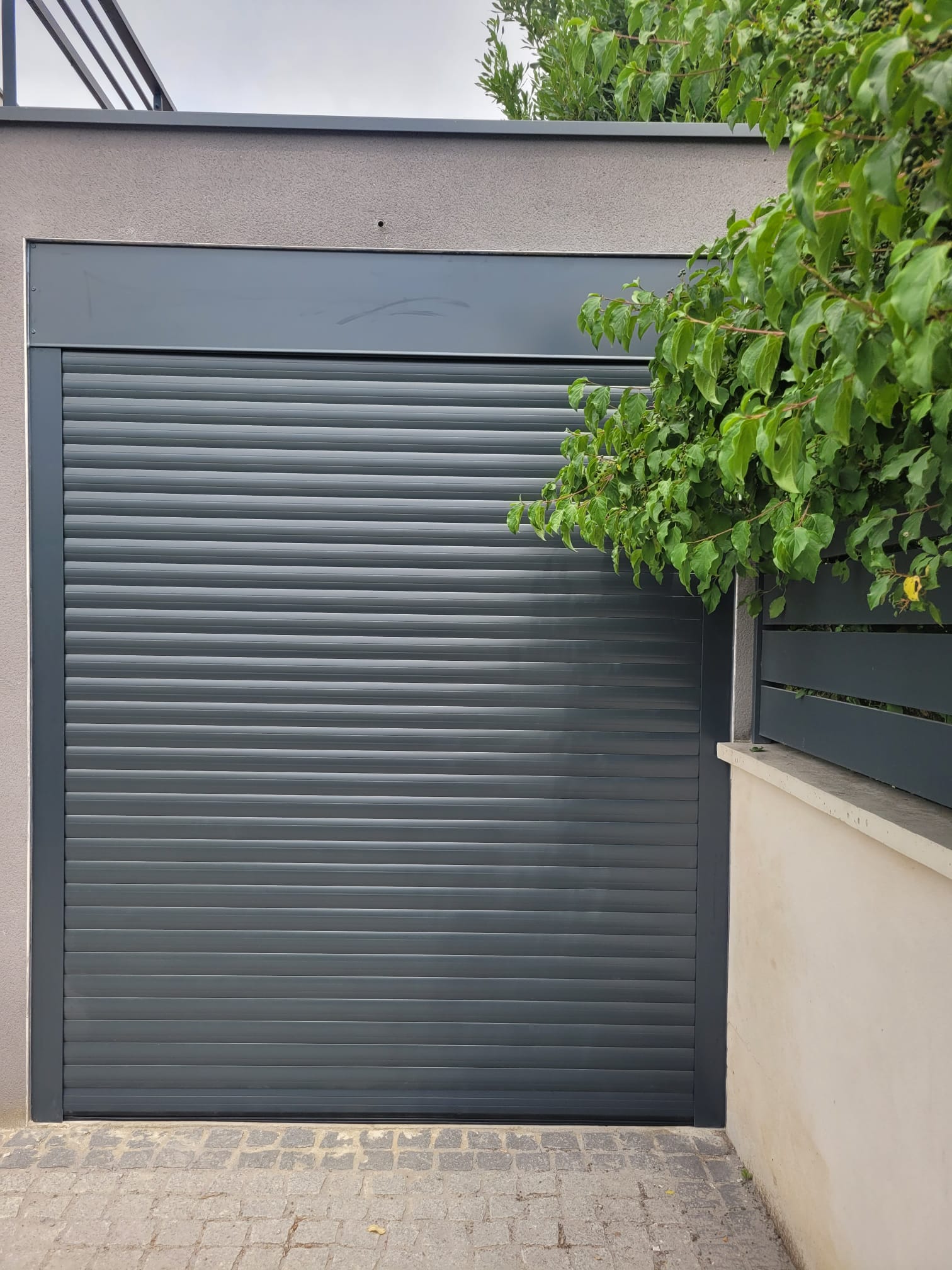 Porte de garage sectionnelle RAL 7016 avec porte d’entrée assortie